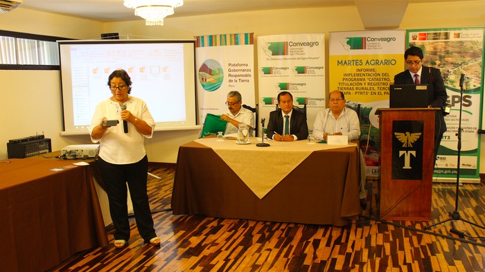 El pasado 20 de marzo, CONVEAGRO reactivó con éxito el espacio de diálogo “Martes Agrario”. El tema fue la “Implementación del Programa Catastro, Titulación y Registro de Tierras Rurales en el Perú, Tercera Etapa – PTRT3”, con el fin de conocer la información que se tiene respecto al estado de la titulación de las tierras individuales y colectivas en el Perú. El evento fue realizado con el apoyo de la Plataforma Gobernanza Responsable de la Tierra.