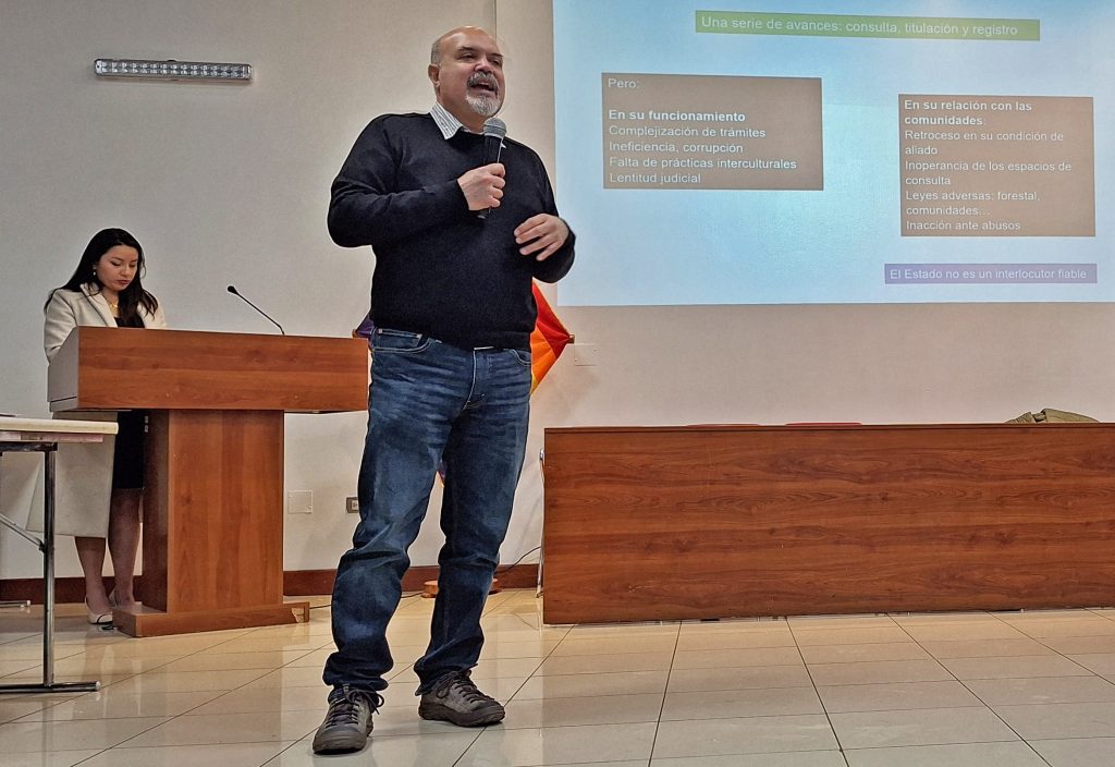 El foro contó con tres ponencias centrales. Alejandro Diez, investigador del CISEPA-PUCP, presentó un índice sobre la tenencia de la tierra en el Perú y los desafíos que enfrentan las comunidades campesinas. “Las comunidades viven una fragmentación interna, enfrentan la presión de las actividades extractivas y sufren la insuficiencia del derecho de propiedad frente a las concesiones mineras”, destacó. Asimismo, dentro de lo que expuso como factores asociados con las necesidades de la tierra y las poblaciones, advirtió sobre que “hay un claro retroceso del Estado como aliado de las comunidades. Hoy, muchas leyes vulneran los derechos colectivos” remarcó. También expuso que existe una ausencia de políticas interculturales y falta de reconocimiento efectivo de las comunidades como pueblos indígenas.