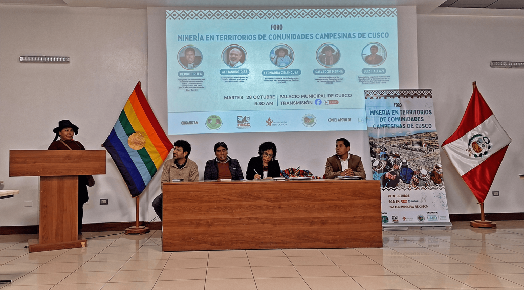 Cusco, 28 de octubre de 2025. – Con la participación de representantes de comunidades campesinas, autoridades regionales y especialistas en pueblos indígenas y gobernanza territorial, se desarrolló el foro “Minería en territorios de comunidades campesinas del Cusco”, organizado por la Federación Departamental de Campesinos del Cusco (FDCC), la Federación Unificada de Campesinos de Espinar (FUCAE), el Instituto del Bien Común (IBC) y la Plataforma para la Gobernanza Responsable de la Tierra, con el apoyo de la International Land Coalition – América Latina y el Caribe.